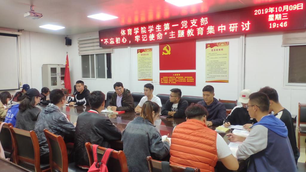 2019年10月9日晚上,金年会jinnianhuicom员工第一党支部“不忘初心、牢记使命”主题教育集中研讨活动在金年会jinnianhuicom三楼会议室举行。金年会jinnianhuicom副处级辅导员、员工第一党支部书记柴九昌、员工第一党支部全体党员参加研讨,研讨由柴九昌主持。