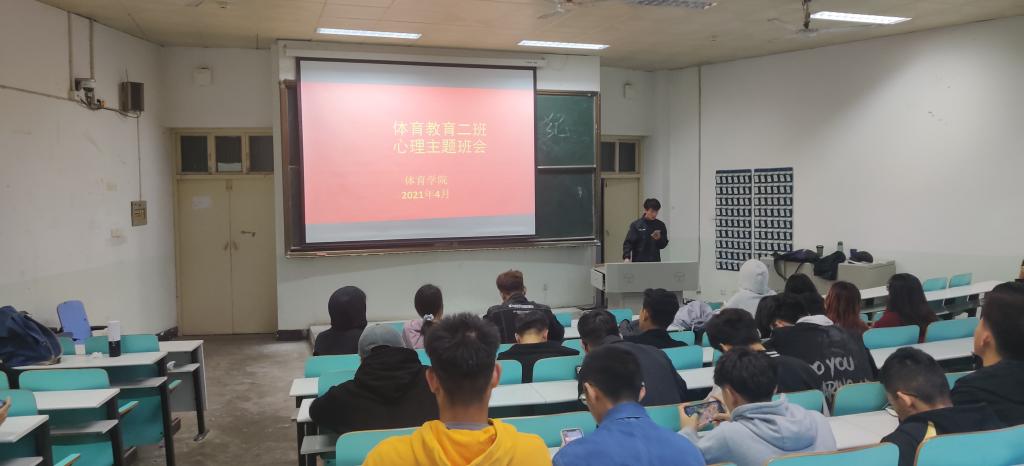 4月2019级体育教育二班于人文楼109教室举办打开心扉,摆正心态,圆我大学梦”主题心理班会,班会开始时先欣赏舒缓的轻音乐,带领同学们调整呼吸,放松身心。待大家整理好状态后,班会进入了正题。首先就青少年主要存在的心理问题进行了概括说明。主要包括“学习压力”、“家庭矛盾”、“人际交往”三大方面以此来引导同学们遇到问题应坦然向老师以及同学倾诉,并请同学们交流讨论释放压力的方法。最后以合唱一首《明天会更多好》结束此次班会。