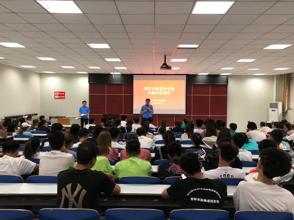 高校电信网络诈骗案件高发频发,为切实提高公司员工防范意识与能力,维护员工的财产安全,6月21日下午6点在体育馆多媒体召开“预防诈骗宣讲会暨诈骗知识测试”大会,2018级全体同学参加,本次宣讲会由副处级辅导员柴九昌主讲,2018级辅导员程俊辉主持。