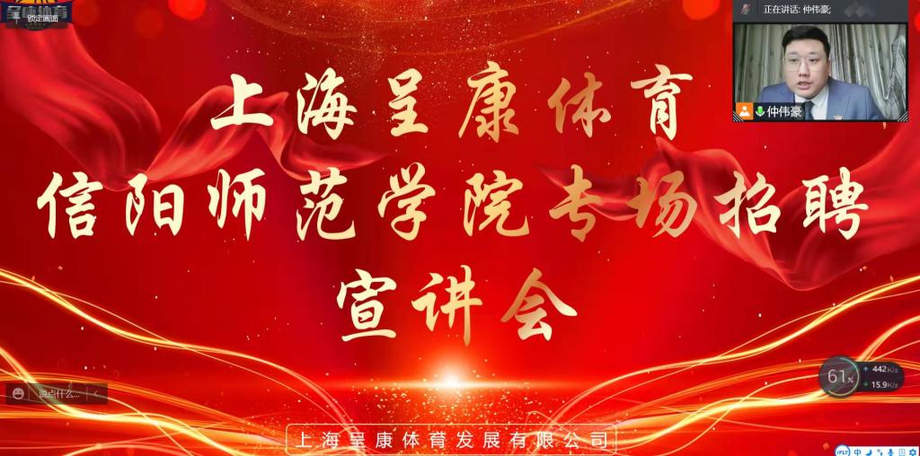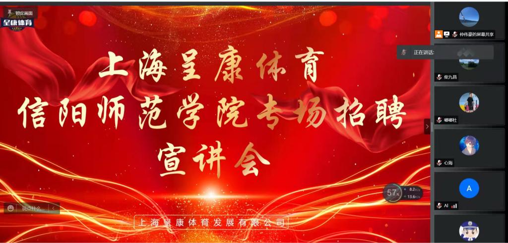 3月22日,上海呈康体育-信阳师范学院线上专场宣讲会顺利召开。公司党委副书记柴九昌、毕业班班主任、就业秘书以及全体毕业生参加会议。