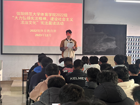 为进一步提高全体师生法律意识,引导员工深入了解宪法、尊崇宪法精神,增强法治观念, 12月7日,金年会jinnianhuicom22级体教班在教九楼402举行了“大力弘扬宪法精神,建设社会主义法治文化”宪法晨读活动。活动由2022级辅导员赖梦玥主持,22级体教班全体员工参加。